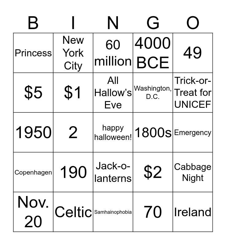This bingo card has a free space and 24 words: 190, Celtic, All Hallow’s Eve, Nov. 20, 49, Princess, $5, New York City, 1800s, Jack-o-lanterns, Washington, D.C., 1950, $2, Cabbage Night, $1, 70, Emergency, 60 million, Trick-or-Treat for UNICEF, 2, Ireland, Copenhagen, 4000 BCE and Samhainophobia.