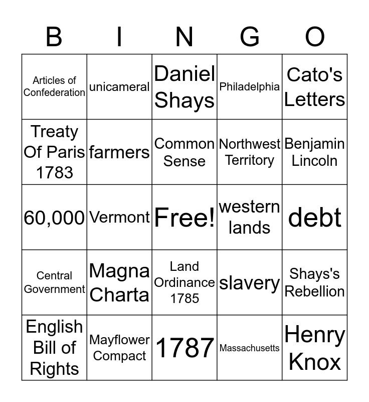 This bingo card has a free space and 24 words: Magna Charta, Mayflower Compact, Common Sense, English Bill of Rights, Cato's Letters, Articles of Confederation, Treaty Of Paris 1783, unicameral, western lands, Land Ordinance 1785, Northwest Territory, 60,000, slavery, Shays's Rebellion, farmers, Massachusetts, debt, Daniel Shays, Benjamin Lincoln, Vermont, Henry Knox, Central Government, Philadelphia and 1787.