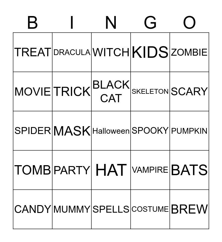 This bingo card has a free space and 29 words: CANDY, GHOSTS, MASK, GOBLIN, TREAT, WITCH, TRICK, PARTY, SPOOKY, MUMMY, PUMPKIN, BREW, SPELLS, COSTUME, SCARY, POSION, HAT, TOMB, ZOMBIE, SPIDER, VAMPIRE, GHOUL, SKELETON, MOVIE, KIDS, DRACULA, BATS, BLACK CAT and CLOWNS.