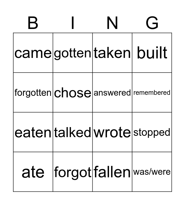 This bingo card has 54 words: Free!, was/were, been, began, begun, brought, built, bought, chose, chosen, came, come, did, done, drank, drunk, ate, eaten, fell, fallen, felt, found, forgot, forgotten, got, gotten, went, gone, lost, made, read, ran, run, took, taken, thought, wrote, written, asked, answered, arrived, belonged, closed, believe, changed, danced, finished, played, remembered, stopped, talked, wanted, walked and worked.