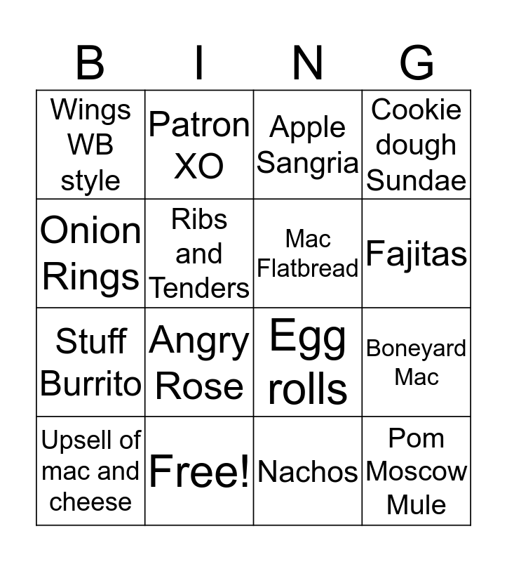 This bingo card has 28 words: Pot Pie, Burrito Bowl, Stuff Burrito, Sampler, Ribs and Tenders, Apple Sangria, Patron XO, Pom Moscow Mule, Free!, E&J Spiked, Egg rolls, Cookie dough Sundae, Bowl of Chili, Cheese Curds, Angry Rose, Vanilla Porter, Fried Pickles, Mac Flatbread, Fajitas, Pot Roast dip, Wings WB style, Cowboy Salad, Upsell of mac and cheese, Boneyard Mac, Nachos, Chips and Queso, Onion Rings and SOup and Salad.