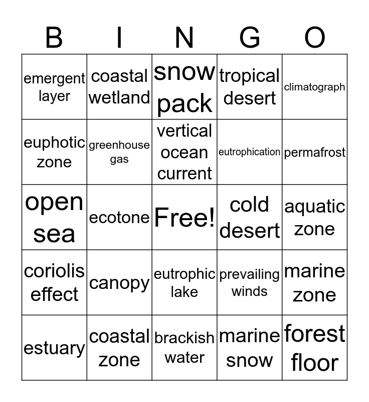 This bingo card has a free space and 36 words: weather, climate, ocean surface current, greenhouse gas, prevailing winds, coriolis effect, vertical ocean current, rain shadow, climatograph, edge effect, ecotone, tropical desert, temperate desert, cold desert, permafrost, emergent layer, understory, canopy, forest floor, snow pack, aquatic zone, marine zone, coastal zone, estuary, brackish water, coastal wetland, open sea, acidification, eutrophication, euphotic zone, disphotic (bathyal), aphotic (abyssal), marine snow, eutrophic lake, oligotrophic lake and watershed.