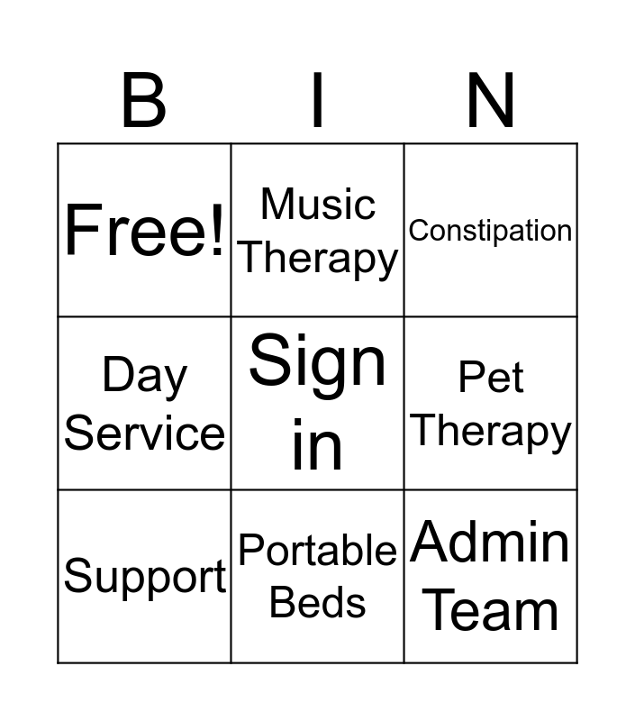 This bingo card has 31 words: Fun, Nursey, Pull up's, Commodes, Free!, Constipation, Support, Scone Thursday, Creative therapy, Bereavement support, Clinics, Nutrition, Massage, Jams, Bric a Brac, Volunteers, Rainbow Place, Hospice, IPU, on call, Sign in, Nurses, counsellors, Music Therapy, Admin Team, Pet Therapy, Day Service, Bucket list wishes, Wheelchair, Portable Beds and Electric chair.