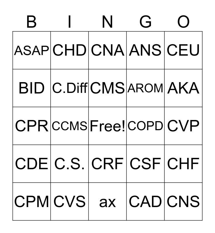 This bingo card has a free space and 32 words: CAD, cath, CCMS, CDC, CDE, C.Diff, CEU, CHF, CHD, cl liq, CMS, CNA, CNP, c/o, COPD, CP, CPM, CPR, CRF, C.S., CSF, CVA, CVP, CVS, CNS, ANS, AROM, BID, ASAP, ax, BKA and AKA.