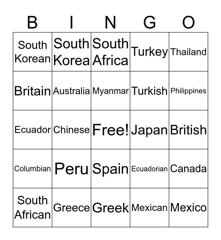 This bingo card has a free space and 38 words: American, Spanish, Brazilian, Australia, Canada, Peru, Myanmar, China, Thailand, Turkish, Chinese, Turkey, Mexico, British, Britain, Columbian, Brazil, South Africa, Australian, Japan, South Korean, Greece, Philippines, South African, Japanese, Greek, Columbia, Chilean, Canadian, Peruvian, Indonesia, Spain, Mexican, South Korea, Singapore, Ecuadorian, Ecuador and Chile.