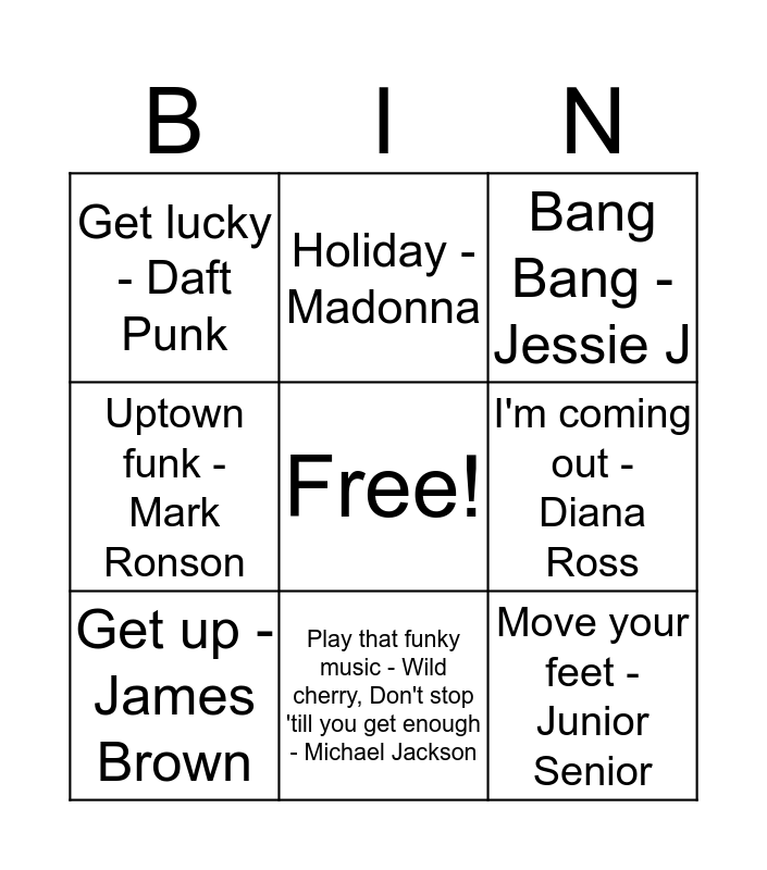 This bingo card has a free space and 24 words: I will service - Gloria Gaynor, Blame it on the boogie - The Jacksons, Play that funky music - Wild cherry, Don't stop 'till you get enough - Michael Jackson, Ain't got no.. I got life - Nina Simone, Move your feet - Junior Senior, Get lucky - Daft Punk, I'm coming out - Diana Ross, Holiday - Madonna, Show me love - Robin S, Happy - Pharell Williams, Groove is in the heart - Deee-Lite, Dancing Queen - ABBA, YMCA - The village people, My everything - Barry White, Get up - James Brown, Atomic - Blondie, Dr. Beat - Miami Sound Machine, Bang Bang - Jessie J, Le Freak - Chic, Wake me up before you go go - Wham!, Freedom - George Michael, I feel love - Donna Summer, Uptown funk - Mark Ronson and Love and understanding - Cher.