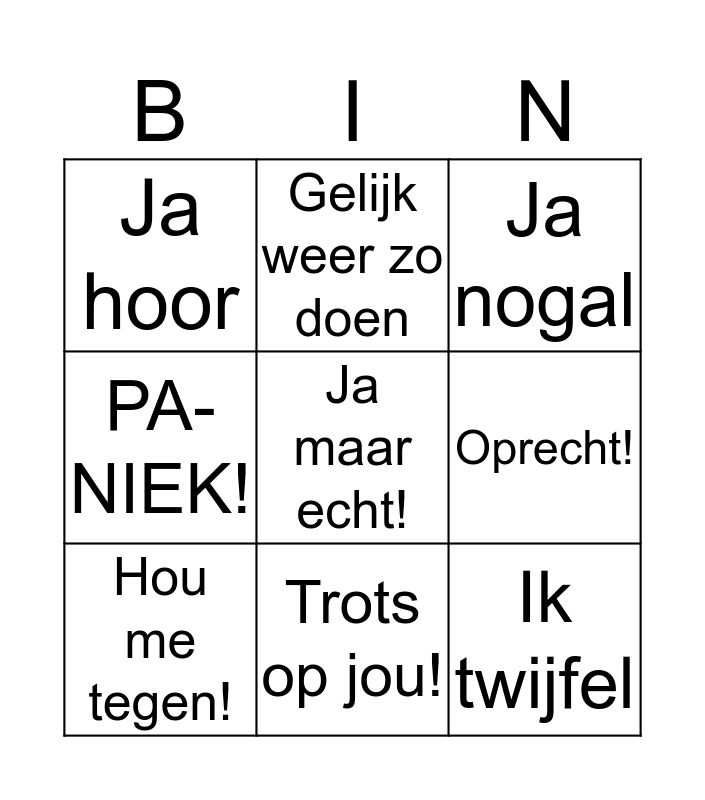 This bingo card has 16 words: Héél leuk, Gaat het?, Ja nogal, Ja hoor, Ik twijfel, Gelijk weer zo doen, Daar baal ik van, Aaaaawwwh, Ja maar echt!, Oprecht!, Intens, PA-NIEK!, Hèèèè, Trots op jou!, Hou me tegen! and Nou, inderdaad!.