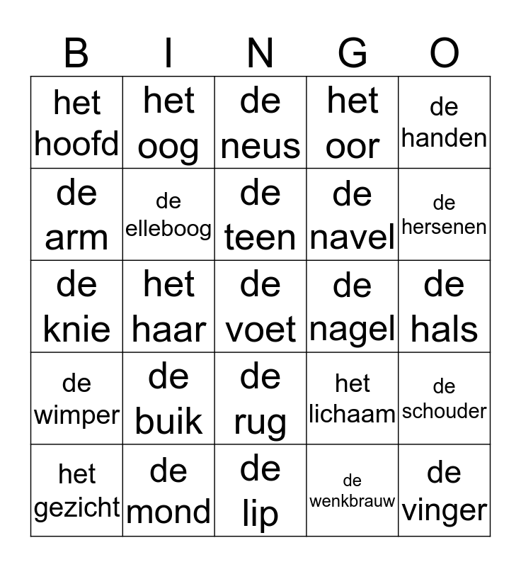 This bingo card has a free space and 24 words: de buik, de mond, de teen, het gezicht, de handen, het hoofd, de arm, het oog, de nagel, de rug, de navel, de knie, het lichaam, de schouder, de elleboog, de wenkbrauw, de hals, de neus, de hersenen, het haar, de vinger, de wimper, het oor and de lip.