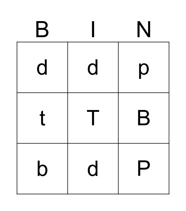 This bingo card has a free space and 9 words: b, p, d, t, d, B, P, D and d.
