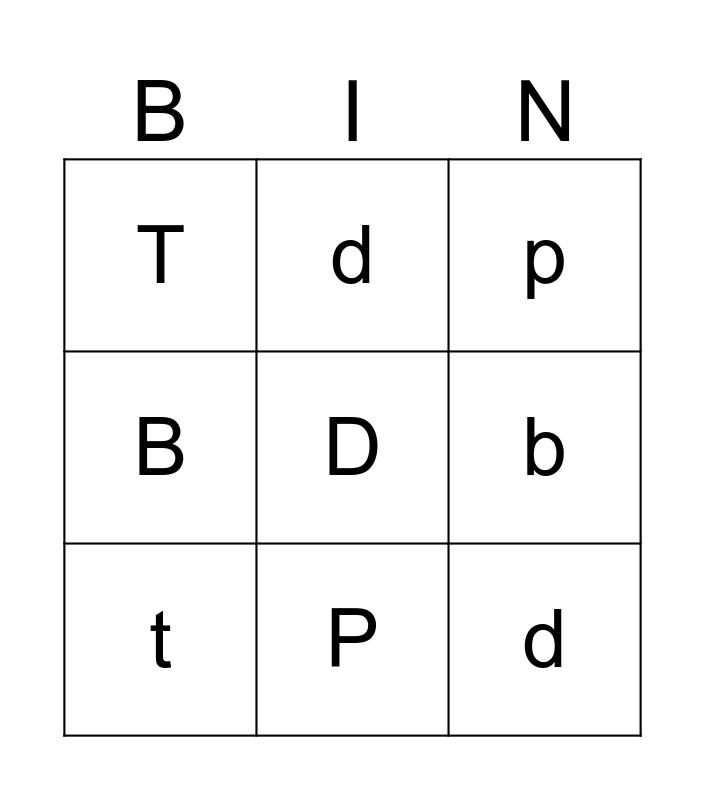 This bingo card has a free space and 8 words: b, p, d, t, T, d, B and P.