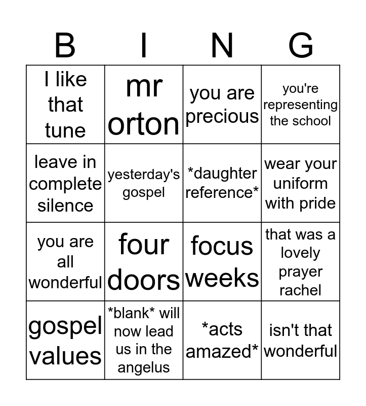 This bingo card has 20 words: that was a lovely prayer rachel, learning leaders please dismiss, you are precious, we are bgn, gospel values, leave in complete silence, *blank* will now lead us in the angelus, I like that tune, you are all wonderful, mr orton, four doors, focus weeks, yesterday's gospel, isn't that wonderful, *daughter reference*, you're all looking so smart, wear your uniform with pride, you're representing the school, *acts amazed* and *sports reference*.