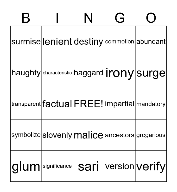 This bingo card has a free space and 60 words: reaction, significance, stress, symbolize, version, annotate, characteristic, derive, irony, literal, commotion, consolidate, haughty, pacify, suppress, surmise, verify, abundant, disciple, haggard, impartial, destiny, glum, gregarious, labyrinth, noxious, paramount, petition, surge, valiant, entice, repel, congenial, disagreeable, lenient, severe, fanciful, factual, opaque, transparent, immaculate, slovenly, mandatory, unnecessary, ancestors, posterity, kindness, disrespect, reverence, malice, sari, sorry, waver, waiver, hostel, hostile, hue, hew, insight and incite.
