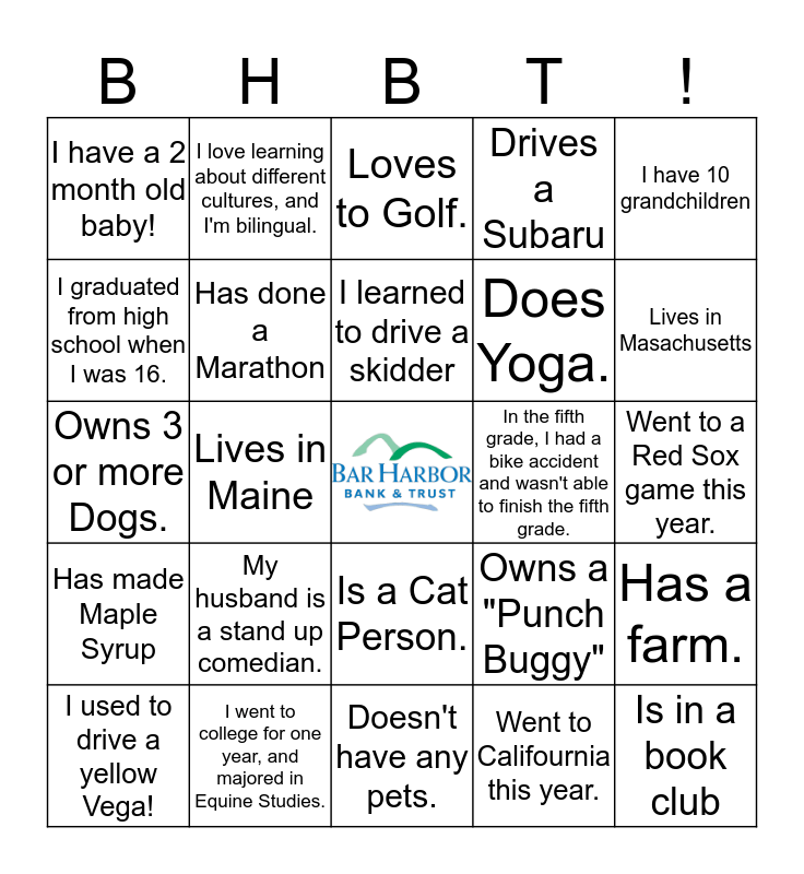 This bingo card has a free space and 24 words: My husband is a stand up comedian., I went to college for one year, and majored in Equine Studies., I learned to drive a skidder, I used to drive a yellow Vega!, I have 10 grandchildren, I have a 2 month old baby!, I graduated from high school when I was 16., I love learning about different cultures, and I'm bilingual., In the fifth grade, I had a bike accident and wasn't able to finish the fifth grade., Is a Cat Person., Does Yoga., Owns 3 or more Dogs., Owns a "Punch Buggy", Has a farm., Has done a Marathon, Went to Califournia this year., Went to a Red Sox game this year., Loves to Golf., Lives in Masachusetts, Lives in Maine, Is in a book club, Has made Maple Syrup, Drives a Subaru and Doesn't have any pets..