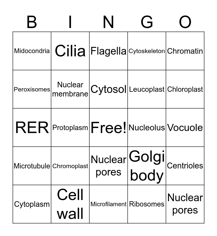 This bingo card has a free space and 24 words: Chromoplast, Cell wall, Cytosol, Cytoplasm, Chromatin, Midocondria, Peroxisomes, Cilia, Nucleolus, Nuclear pores, Leucoplast, RER, Golgi body, Centrioles, Nuclear membrane, Ribosomes, Vocuole, Flagella, Chloroplast, Protoplasm, Nuclear pores, Microtubule, Cytoskeleton and Microfilament.