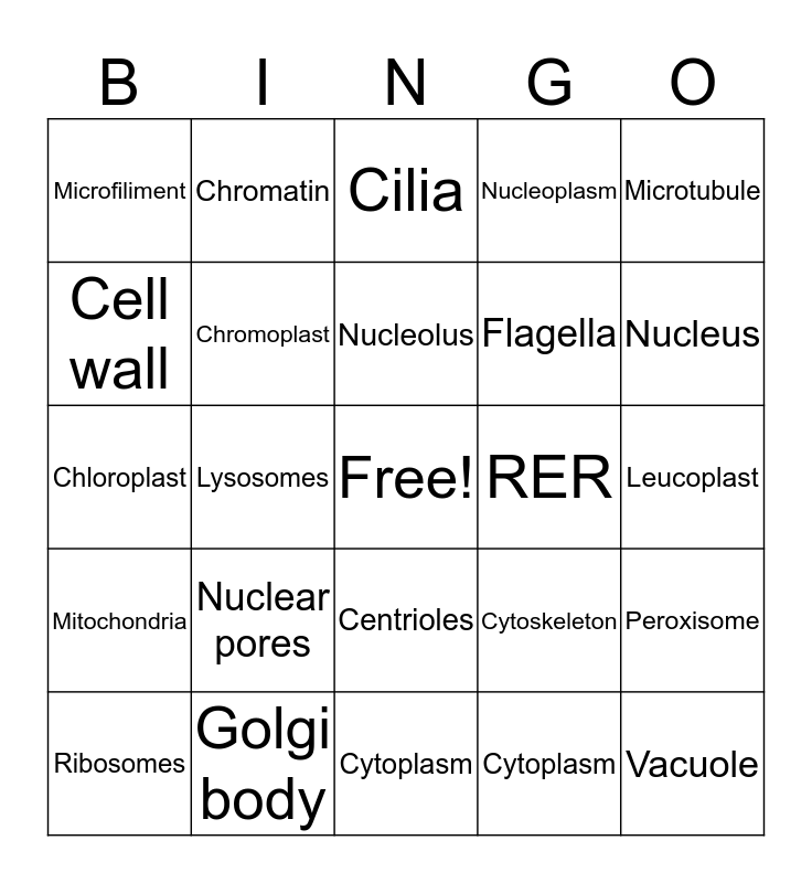 This bingo card has a free space and 24 words: Nuclear pores, Golgi body, Nucleolus, Ribosomes, Microtubule, Microfiliment, Cell wall, Chromatin, RER, Centrioles, Flagella, Chloroplast, Cytoskeleton, Peroxisome, Chromoplast, Cytoplasm, Leucoplast, Cilia, Nucleus, Lysosomes, Vacuole, Mitochondria, Nucleoplasm and Cytoplasm.