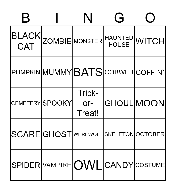 This bingo card has a free space and 24 words: GHOST, VAMPIRE, BATS, SPIDER, WITCH, BLACK CAT, PUMPKIN, ZOMBIE, GHOUL, WEREWOLF, COBWEB, CEMETERY, SKELETON, OCTOBER, MUMMY, CANDY, MOON, MONSTER, COFFIN`, SPOOKY, COSTUME, SCARE, HAUNTED HOUSE and OWL.