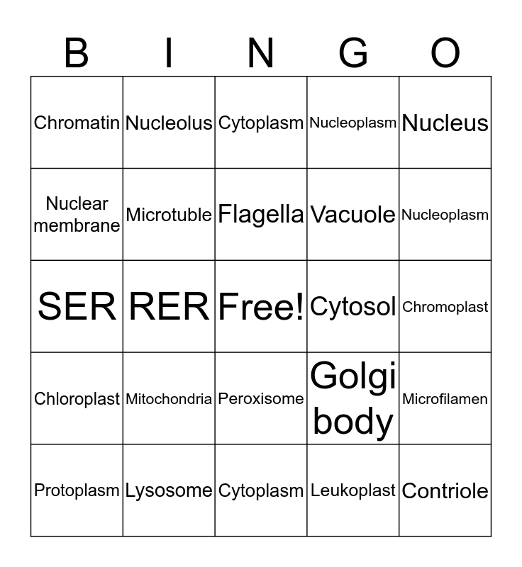 This bingo card has a free space and 29 words: Protoplasm, Lysosome, RER, Cytoskeleton, Chromatin, Cytoplasm, Microtuble, Mitochondria, Cytosol, Lysosome, Chromoplast, Contriole, Cytoplasm, Leukoplast, Nucleoplasm, Cilia, Peroxisome, Chloroplast, Nucleus, SER, Golgi body, Ribosome, Vacuole, Nuclear membrane, Nucleoplasm, Nucleolus, Microfilamen, Flagella and Cell wall.
