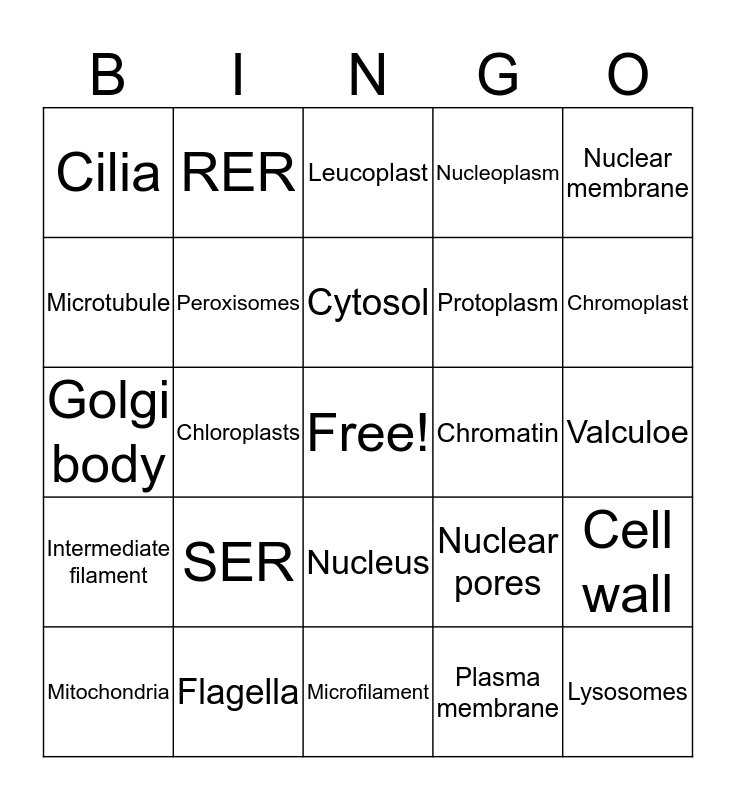 This bingo card has a free space and 24 words: SER, Flagella, Cytosol, Mitochondria, Nuclear membrane, Cilia, Microtubule, RER, Chromatin, Nucleus, Protoplasm, Golgi body, Nuclear pores, Cell wall, Peroxisomes, Plasma membrane, Valculoe, Leucoplast, Chromoplast, Chloroplasts, Lysosomes, Intermediate filament, Nucleoplasm and Microfilament.