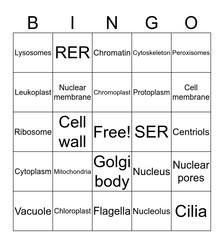This bingo card has a free space and 24 words: Mitochondria, Chloroplast, Chromoplast, Vacuole, Peroxisomes, Lysosomes, Leukoplast, RER, SER, Golgi body, Protoplasm, Ribosome, Nucleus, Nuclear pores, Nuclear membrane, Nucleolus, Centriols, Chromatin, Cell membrane, Cell wall, Cilia, Cytoplasm, Cytoskeleton and Flagella.