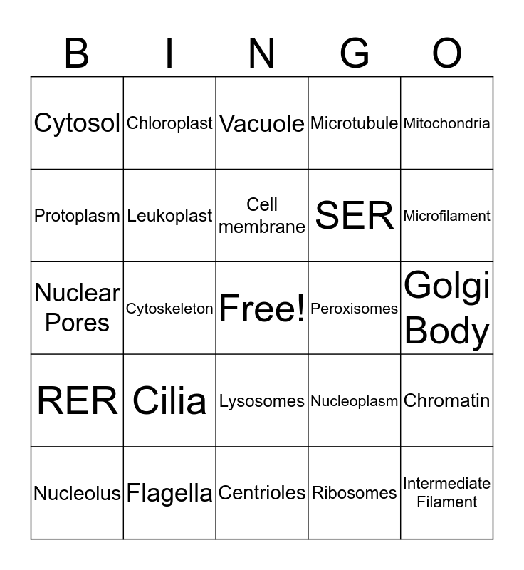 This bingo card has a free space and 24 words: Cilia, Flagella, Cell membrane, Nucleolus, Mitochondria, Cytosol, Protoplasm, Chloroplast, Peroxisomes, Lysosomes, SER, Nuclear Pores, Nucleoplasm, Chromatin, Leukoplast, Ribosomes, Golgi Body, Vacuole, Microfilament, Cytoskeleton, Intermediate Filament, RER, Microtubule and Centrioles.