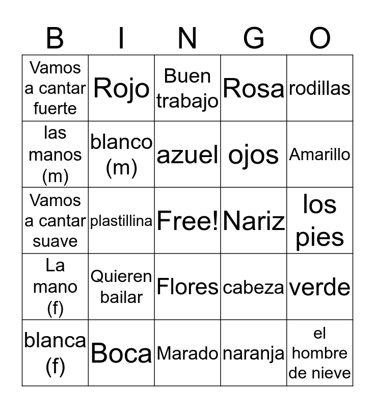 This bingo card has a free space and 29 words: blanca (f), el pies, plastillina, una vez mas, Vamos a cantar fuerte, Buen trabajo, blanco (m), Quieren bailar, Nariz, Boca, los pies, el hombre de nieve, Marado, naranja, Amarillo, Ofrenda, Flores, La mano (f), rodillas, Vamos a cantar suave, cabeza, hombros, ojos, las manos (m), Rosa, Rojo, verde, azuel and orejas.