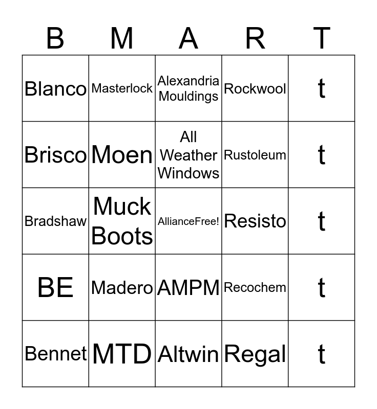 This bingo card has a free space and 24 words: Bennet, Madero, All Weather Windows, Regal, t, Blanco, Masterlock, Alexandria Mouldings, Resisto, t, Bradshaw, Moen, Recochem, t, Brisco, MTD, Altwin, Rockwool, t, BE, Muck Boots, AMPM, Rustoleum and t.
