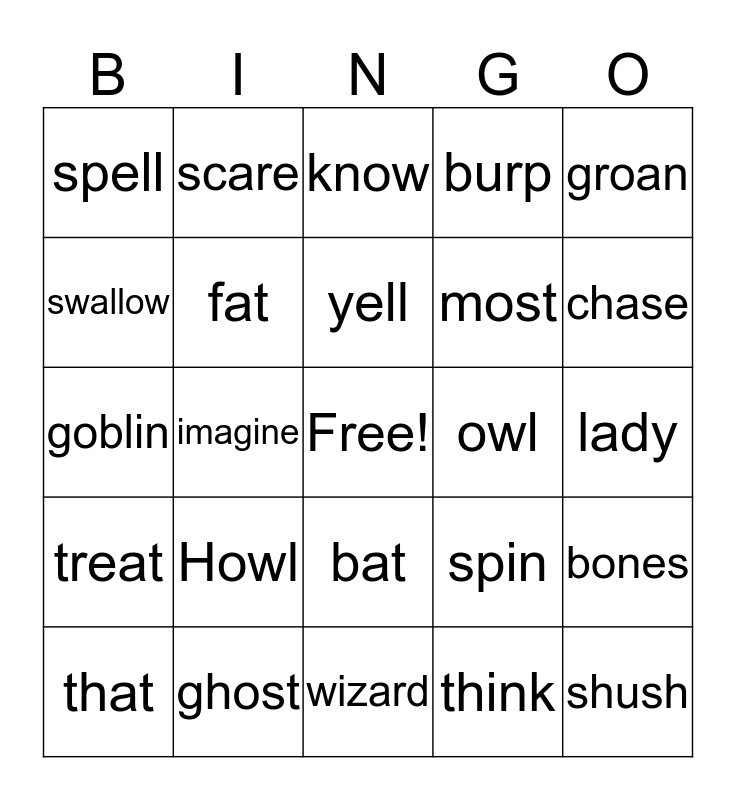 This bingo card has a free space and 24 words: Howl, ghost, yell, that, groan, spell, swallow, scare, owl, bat, most, goblin, spin, bones, fat, think, lady, know, chase, imagine, shush, treat, burp and wizard.