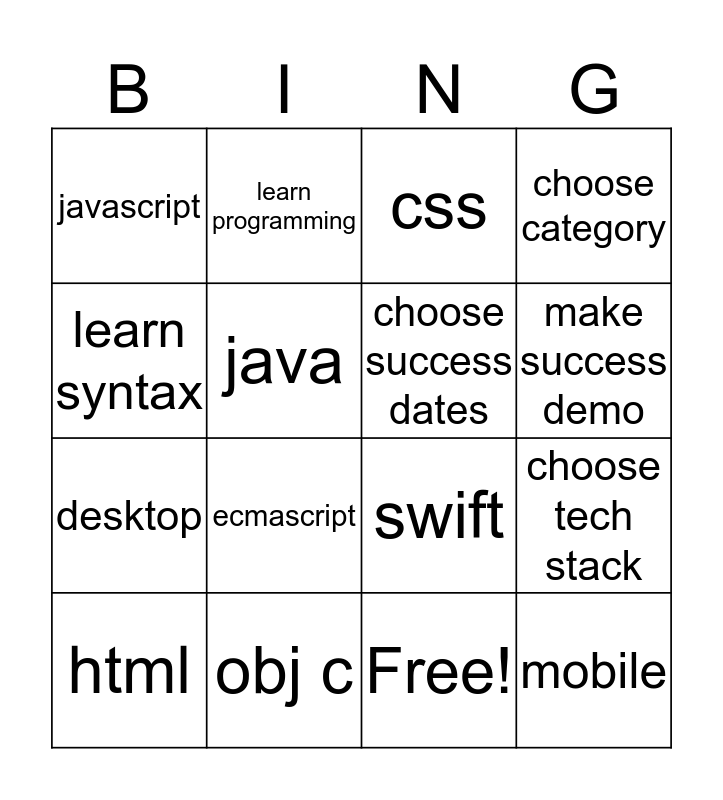 This bingo card has 17 words: Free!, html, css, javascript, ecmascript, choose category, choose tech stack, choose success dates, make success demo, java, obj c, swift, learn syntax, learn programming, desktop, web and mobile.