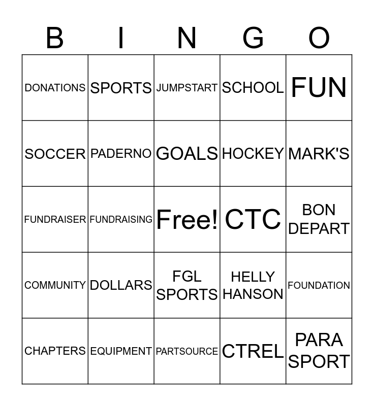 This bingo card has a free space and 30 words: EQUIPMENT, PARTNERSHIP, FUNDRAISING, FOOTBALL, DONATIONS, JUMPSTART, PADERNO, FGL SPORTS, CTC, PARTSOURCE, BON DEPART, PARA SPORT, CTREL, CTREIT, MARK'S, GAS+, HELLY HANSON, COMMUNITY, DOLLARS, FUN, FUNDRAISER, KIDS, SPORTS, HOCKEY, SOCCER, SCHOOL, FOUNDATION, CHAPTERS, GOALS and CTP.