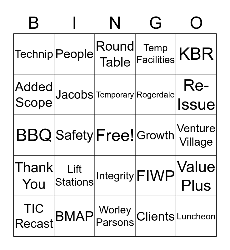 This bingo card has a free space and 34 words: Exxon, Beaumont, Blade, E1.1, Venture Village, Added Scope, Jacobs, Worley Parsons, Rogerdale, Luncheon, BBQ, People, Clients, Performance, Thank You, Safety, Integrity, Growth, Value Plus, TIC Recast, BMAP, Olin Rd, Temp Facilities, Re-Issue, Fire Training Bldg, Lift Stations, Round Table, Arcadis, KBR, Technip, Early Works, Temporary, FIWP and MLK Improvements.