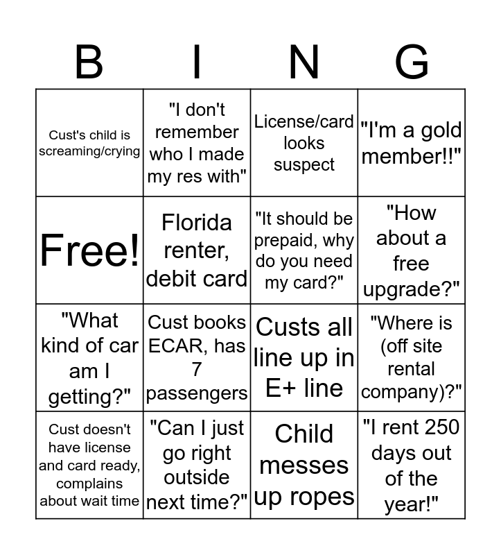 This bingo card has 16 words: "Can I just go right outside next time?", "Where is (off site rental company)?", License/card looks suspect, Cust's child is screaming/crying, "What kind of car am I getting?", "I don't remember who I made my res with", Custs all line up in E+ line, Child messes up ropes, Free!, Florida renter, debit card, Cust doesn't have license and card ready, complains about wait time, "I'm a gold member!!", Cust books ECAR, has 7 passengers, "How about a free upgrade?", "It should be prepaid, why do you need my card?" and "I rent 250 days out of the year!".