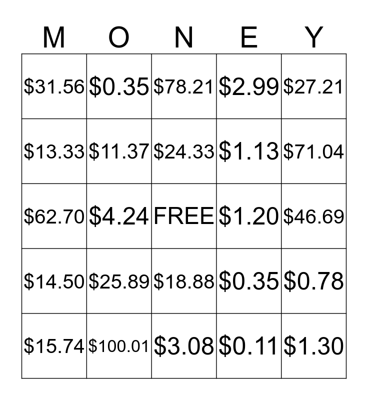 This bingo card has a free space and 29 words: $15.74, $1.34, $4.24, $11.02, $31.56, $78.21, $11.37, $25.89, $1.20, $100.01, $46.69, $1.30, $3.08, $0.11, $71.04, $0.17, $18.88, $14.50, $27.21, $62.70, $0.35, $13.65, $1.13, $13.33, $2.99, $0.35, $0.78, $24.33 and $1.09.
