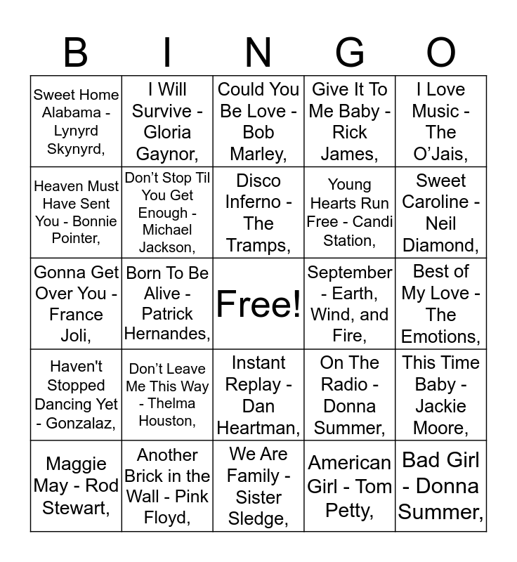 This bingo card has a free space and 52 words: Let’s Get It On - Marvin Gaye,, Bad Girl - Donna Summer,, Heaven Must Be Missing an Angel - Tavares,, We Are Family - Sister Sledge,, Don’t Leave Me This Way - Thelma Houston,, Copacabana - Barry Manilow,, I Will Survive - Gloria Gaynor,, Feels Like I’m In Love - Kelly Marie,, Heaven Must Have Sent You - Bonnie Pointer,, Knock on Wood - Amii Stewart,, Don’t Stop Til You Get Enough - Michael Jackson,, You Should Be Dancing - Bee Gees,, This Time Baby - Jackie Moore,, On The Radio - Donna Summer,, MacArthur Park - Donna Summer,, My First, My Last, My Everything - Barry White,, Disco Inferno - The Tramps,, September - Earth, Wind, and Fire,, Let’s Groove - Earth, Wind, and Fire,, I Love Music - The O’Jais,, Born To Be Alive - Patrick Hernandes,, American Girl - Tom Petty,, Sweet Home Alabama - Lynyrd Skynyrd,, Young Hearts Run Free - Candi Station,, Upside Down - Diana Ross,, Crocodile Rock - Elton John,, Sir Duke - Stevie Wonder,, Ladies Night - Kool & The Gang,, Sweet Caroline - Neil Diamond,, Saturday In The Park - Chicago,, Long Train Running - Doobie Brothers,, Give It To Me Baby - Rick James,, December 1963 - The Four Seasons,, Got To Be Real - Cheryl Lynn,, Working My Way Back To You - The Spinners,, Could You Be Love - Bob Marley,, Another Brick in the Wall - Pink Floyd,, Paradise By The Dashboard Light - Meatloaf,, Keep It Coming Love - KC and The Sunshine Band,, Dancing Queen - ABBA,, Stayin Alive - Bee Gees,, Best of My Love - The Emotions,, Haven't Stopped Dancing Yet - Gonzalaz,, You Ain’t Seen Nothing Yet - Bachman,, Instant Replay - Dan Heartman,, Do You Wanna Funk - Sylvester,, There But For The Grace of God - Machine,, Gonna Get Over You - France Joli,, Piano Man - Billy Joel,, Ain’t No Stopping Us Now - McFadden & Whitehead,, Maggie May - Rod Stewart, and Do You Think I’m Sexy - Rod Stewart,.