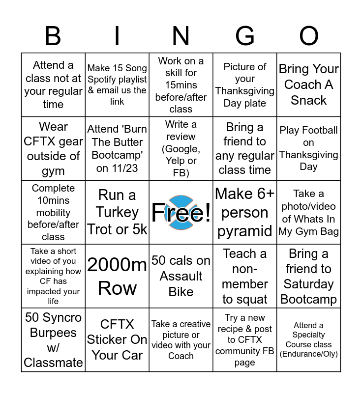 This bingo card has a free space and 24 words: 2000m Row, CFTX Sticker On Your Car, Write a review (Google, Yelp or FB), 50 Syncro Burpees w/ Classmate, Bring Your Coach A Snack, Attend a class not at your regular time, Wear CFTX gear outside of gym, Make 15 Song Spotify playlist & email us the link, Make 6+ person pyramid, 50 cals on Assault Bike, Bring a friend to any regular class time, Complete 10mins mobility before/after class, Teach a non-member to squat, Bring a friend to Saturday Bootcamp, Attend 'Burn The Butter Bootcamp' on 11/23, Try a new recipe & post to CFTX community FB page, Take a photo/video of Whats In My Gym Bag, Work on a skill for 15mins before/after class, Play Football on Thanksgiving Day, Run a Turkey Trot or 5k, Attend a Specialty Course class (Endurance/Oly), Take a short video of you explaining how CF has impacted your life, Picture of your Thanksgiving Day plate and Take a creative picture or video with your Coach.