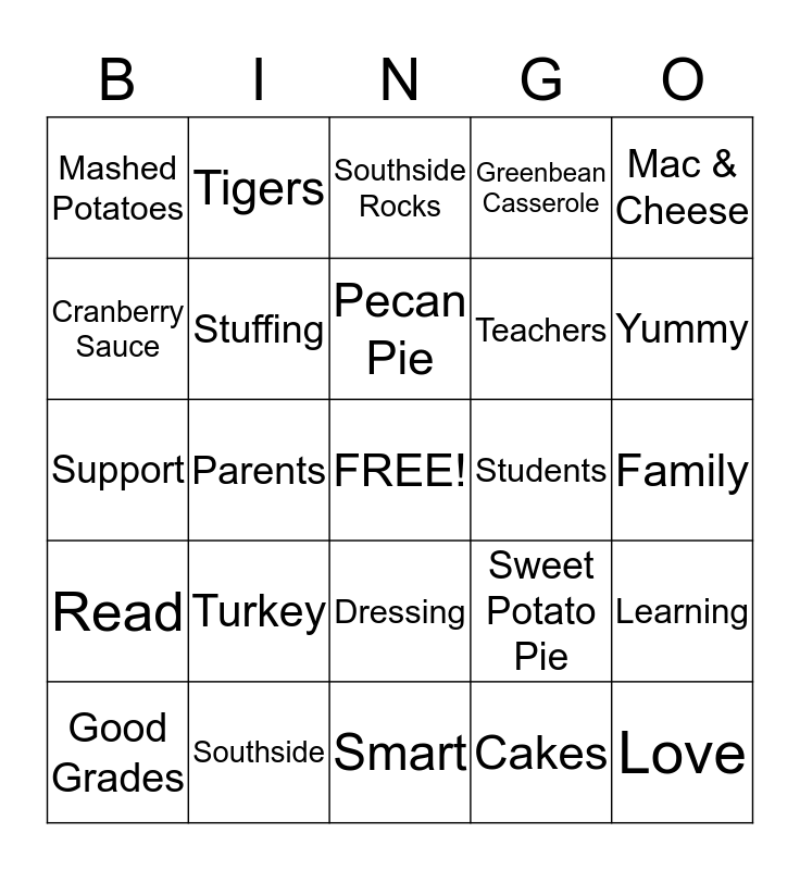 This bingo card has a free space and 24 words: Turkey, Southside, Pecan Pie, Good Grades, Mac & Cheese, Mashed Potatoes, Cranberry Sauce, Tigers, Students, Dressing, Teachers, Support, Sweet Potato Pie, Learning, Stuffing, Cakes, Family, Southside Rocks, Yummy, Parents, Love, Read, Greenbean Casserole and Smart.