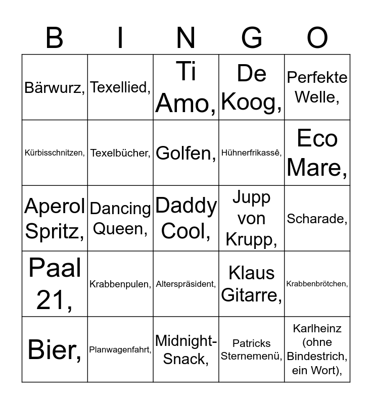 This bingo card has 56 words: Free!, Bier,, Stauder,, Bärwurz,, Midnight-Snack,, Usch & Musch,, Texelbücher,, Sol-Eier,, Hühnerfrikassê,, Computerecke,, De Koog,, Kartrennen,, Horsts Zauberschau,, SingStar,, Kleiner grüner Kaktus,, Kinderdisco,, Perfekte Welle,, Dancing Queen,, VMCA,, Daddy Cool,, Jupp von Krupp,, Ameland,, Klaus Gitarre,, Ti Amo,, Witwe Bolte,, Golfen,, Country Roads,, Udos Suppengeschichten,, Eco Mare,, Vogelhuis,, Tanjas Geburtstag,, Salatbar,, Fußball,, Wer bin ich?,, Scharade,, Kürbisschnitzen,, Aperol Spritz,, Texelfilme,, Paal 21,, Texellied,, Alterspräsident,, Karlheinz (ohne Bindestrich, ein Wort),, Strandspaziergang,, Atz im Klo,, Anja hat "Grippe",, Krabbenpulen,, Planwagenfahrt,, Den Burg,, Mienterglob,, Keg-Verschluss,, Patricks Sternemenü,, Loriots Eheberatung,, Kinder Badespaß,, Pokerabend,, Krabbenbrötchen, and Paß-Sippe,.