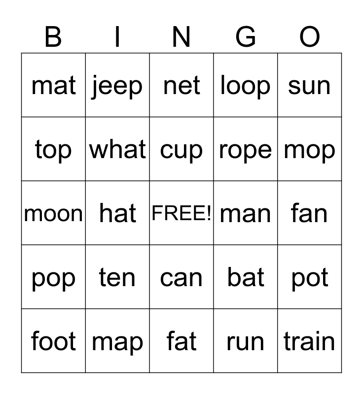 This bingo card has a free space and 24 words: ten, map, cup, foot, sun, mat, top, jeep, man, can, rope, moon, bat, pot, what, run, fan, net, mop, hat, train, pop, loop and fat.