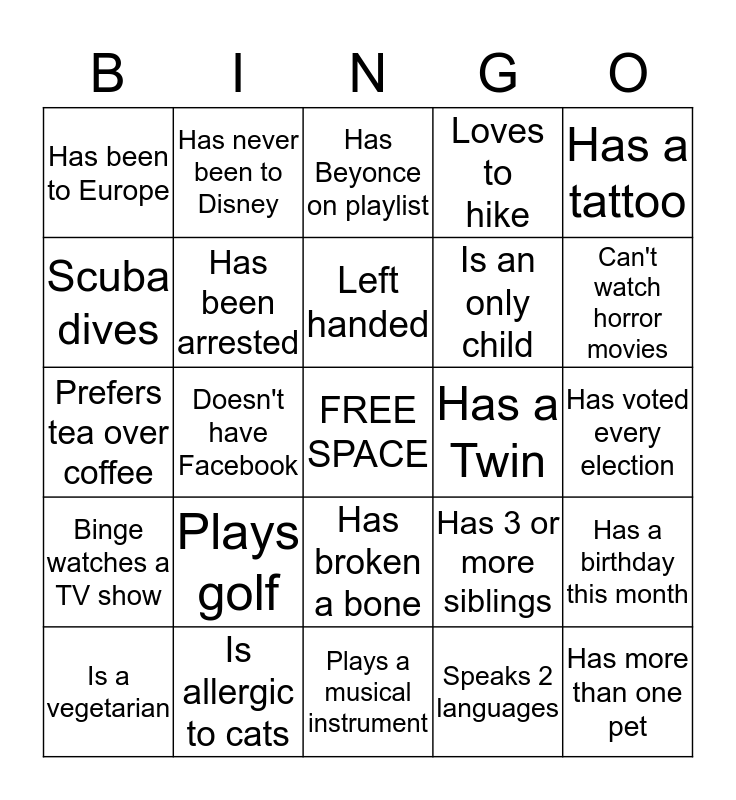 This bingo card has a free space and 24 words: Plays golf, Is allergic to cats, Left handed, Is a vegetarian, Has a tattoo, Has been to Europe, Scuba dives, Has never been to Disney, Has a Twin, Has broken a bone, Is an only child, Prefers tea over coffee, Has 3 or more siblings, Has a birthday this month, Has been arrested, Speaks 2 languages, Has voted every election, Has Beyonce on playlist, Can't watch horror movies, Doesn't have Facebook, Has more than one pet, Binge watches a TV show, Loves to hike and Plays a musical instrument.