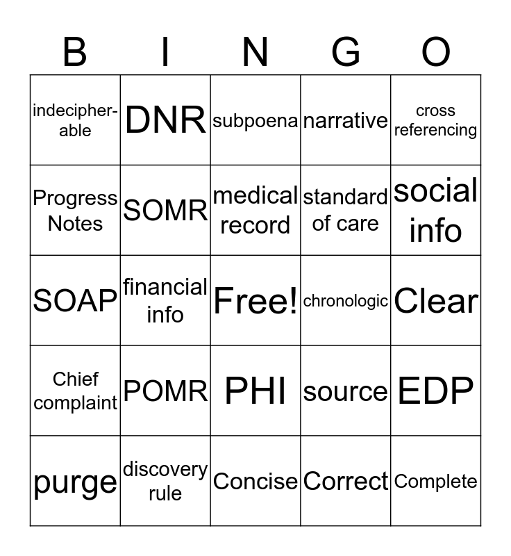 This bingo card has a free space and 24 words: POMR, discovery rule, medical record, purge, cross referencing, indecipher-able, Progress Notes, DNR, chronologic, PHI, standard of care, SOAP, source, EDP, SOMR, Correct, Clear, subpoena, social info, financial info, Complete, Chief complaint, narrative and Concise.