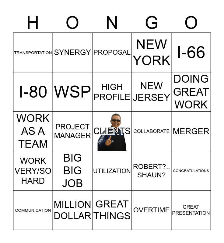 This bingo card has a free space and 29 words: COMMUNICATION, VERY BUSY, PROJECT MANAGER, BIG PROJECT, TRANSPORTATION, PROPOSAL, WSP, BIG BIG JOB, COLLABORATE, MILLION DOLLAR, MERGER, GREAT PRESENTATION, GREAT THINGS, OVERTIME, DOING GREAT WORK, YOUNG ENGINEERS, UTILIZATION, WORK VERY/SO HARD, I-66, WORK AS A TEAM, ROBERT?.. SHAUN?, BETWEEN OFFICES, NEW JERSEY, I-80, NEW YORK, SYNERGY, CONGRATULATIONS, HIGH PROFILE and NOMINATIONS.