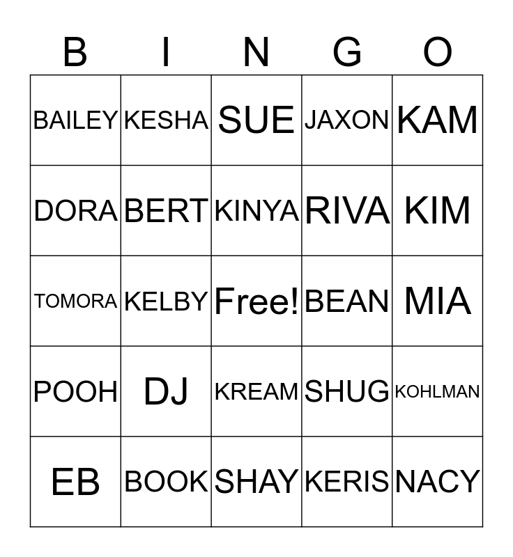 This bingo card has a free space and 24 words: DJ, BOOK, KINYA, EB, KAM, BAILEY, DORA, KESHA, BEAN, KREAM, RIVA, TOMORA, SHUG, KOHLMAN, BERT, KERIS, MIA, SUE, KIM, KELBY, NACY, POOH, JAXON and SHAY.