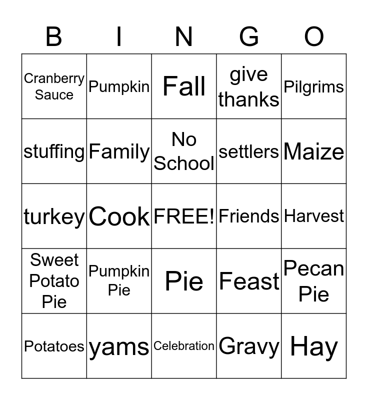 This bingo card has a free space and 31 words: Celebration, Colony, Cook, Corn, Cranberry Sauce, Fall, Family, Feast, Friends, Gravy, Harvest, Hay, Holidays, Indians, Maize, Mayflower, Pecan Pie, Pumpkin Pie, Sweet Potato Pie, Pie, Pilgrims, Plymouth, Potatoes, Pumpkin, settlers, stuffing, give thanks, turkey, yams, No School and thankful.