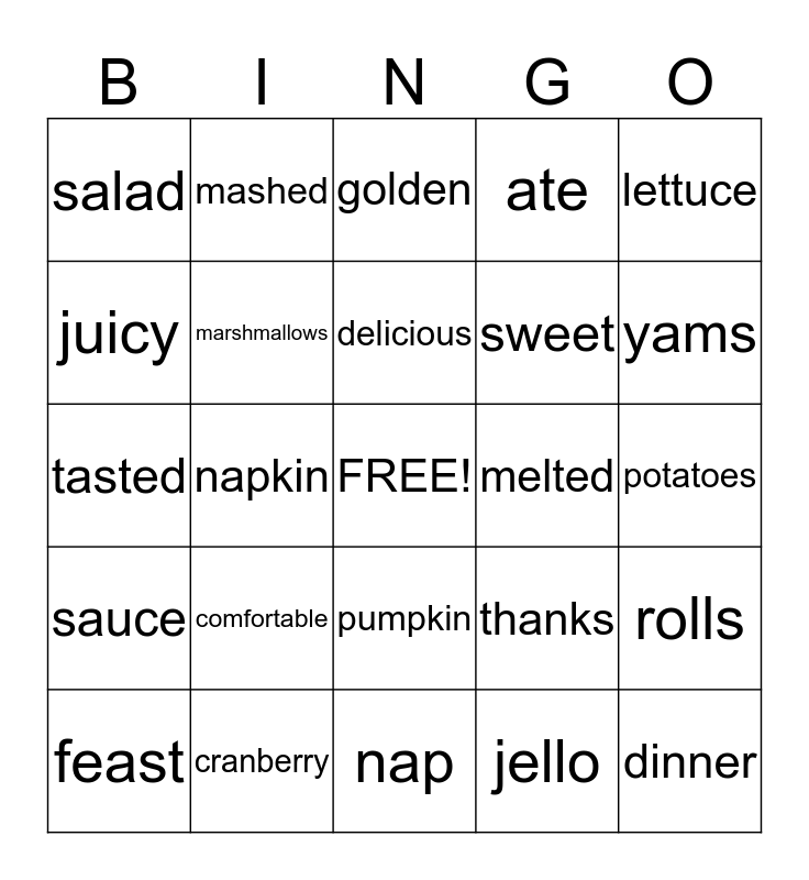 This bingo card has a free space and 24 words: comfortable, cranberry, delicious, feast, lettuce, salad, juicy, mashed, melted, pumpkin, sweet, tasted, thanks, rolls, marshmallows, jello, potatoes, golden, yams, napkin, dinner, sauce, ate and nap.