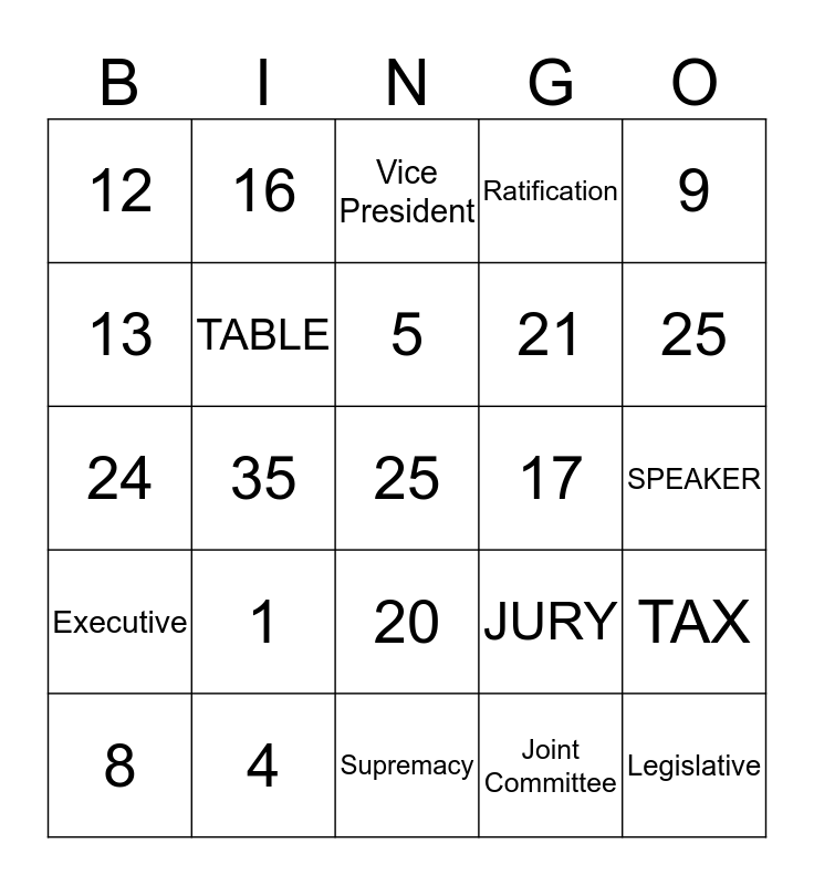 This bingo card has a free space and 24 words: 1, 4, 5, 8, 9, 12, 13, 16, 17, 20, 21, 24, JURY, TAX, TABLE, Joint Committee, SPEAKER, Vice President, 25, 35, Legislative, Executive, Ratification and Supremacy.