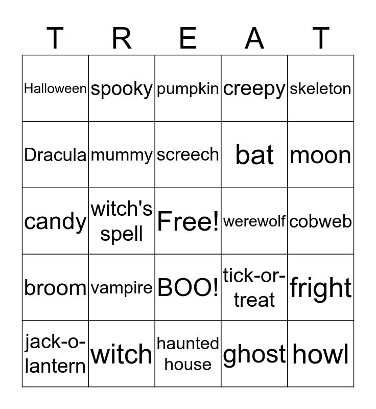 This bingo card has a free space and 29 words: jack-o-lantern, mask, witch's spell, costume, Halloween, pumpkin, mummy, vampire, werewolf, witch, cobweb, howl, haunted house, ghost, moon, black cat, BOO!, broom, skeleton, candy, tick-or-treat, carve, bat, Dracula, creepy, spooky, fright, screech and dinosaur.