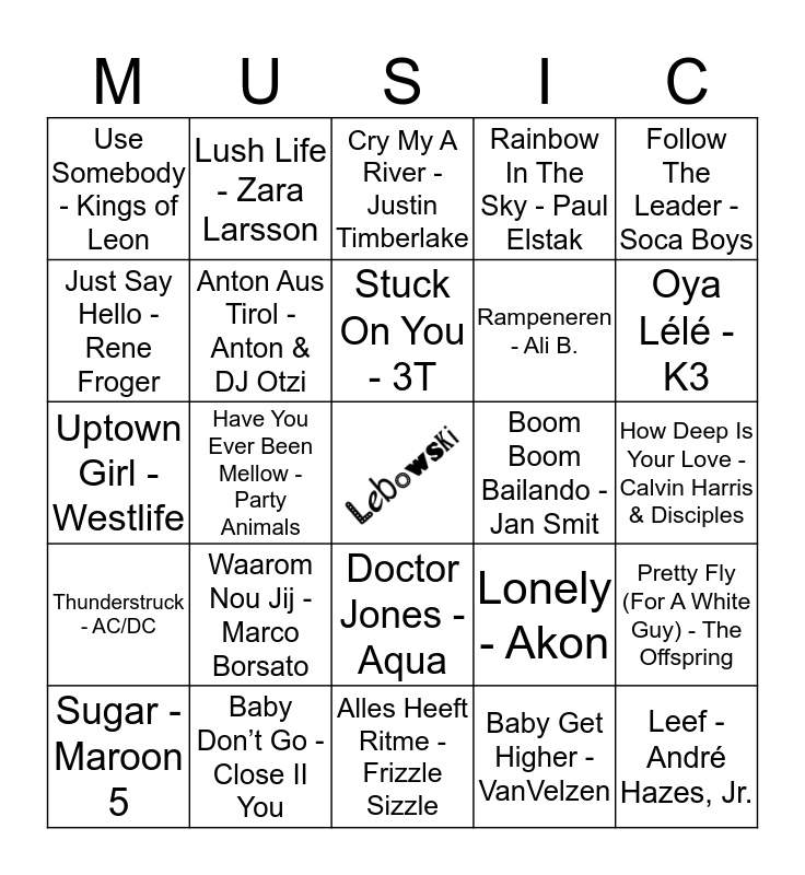 This bingo card has a free space and 24 words: Waarom Nou Jij - Marco Borsato, Baby Don’t Go - Close II You, Stuck On You - 3T, Sugar - Maroon 5, Follow The Leader - Soca Boys, Use Somebody - Kings of Leon, Just Say Hello - Rene Froger, Lush Life - Zara Larsson, Boom Boom Bailando - Jan Smit, Doctor Jones - Aqua, Rampeneren - Ali B., Uptown Girl - Westlife, Lonely - Akon, Pretty Fly (For A White Guy) - The Offspring, Anton Aus Tirol - Anton & DJ Otzi, Baby Get Higher - VanVelzen, How Deep Is Your Love - Calvin Harris & Disciples, Cry My A River - Justin Timberlake, Oya Lélé - K3, Have You Ever Been Mellow - Party Animals, Leef - André Hazes, Jr., Thunderstruck - AC/DC, Rainbow In The Sky - Paul Elstak and Alles Heeft Ritme - Frizzle Sizzle.
