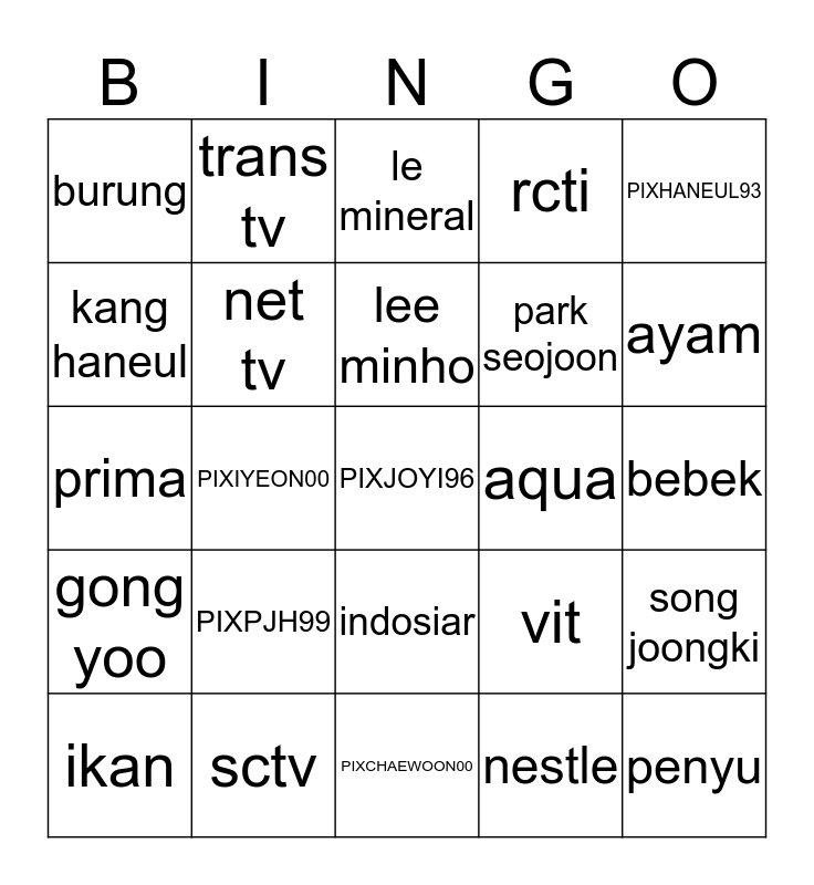 This bingo card has a free space and 24 words: PIXPJH99, sctv, lee minho, ikan, PIXHANEUL93, burung, kang haneul, trans tv, aqua, indosiar, park seojoon, prima, vit, song joongki, net tv, nestle, bebek, le mineral, ayam, PIXIYEON00, penyu, gong yoo, rcti and PIXCHAEWOON00.