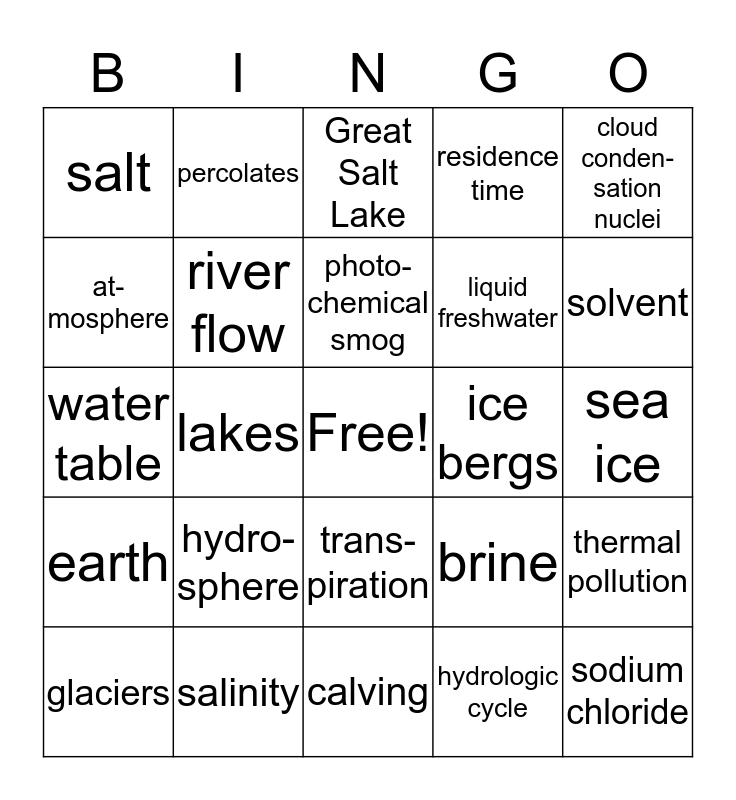 This bingo card has a free space and 44 words: ground-water, hydro-sphere, surface freshwater, hydrologic cycle, precip-itation, surface runoff, river flow, distillation, residence time, sodium chloride, salt, salinity, brine, sea ice, firn, ice shelves, calving, ice bergs, soil moisture, water table, percolates, trans-piration, adiabatic cooling, cloud conden- sation nuclei, smog, fog, photo-chemical smog, water pollution, thermal pollution, glaciers, Dead Sea, Great Salt Lake, conden-sation, magnesium sulfate, earth, oceans, salt water, solute, solvent, at-mosphere, lakes, swamps, liquid freshwater and freshwater.