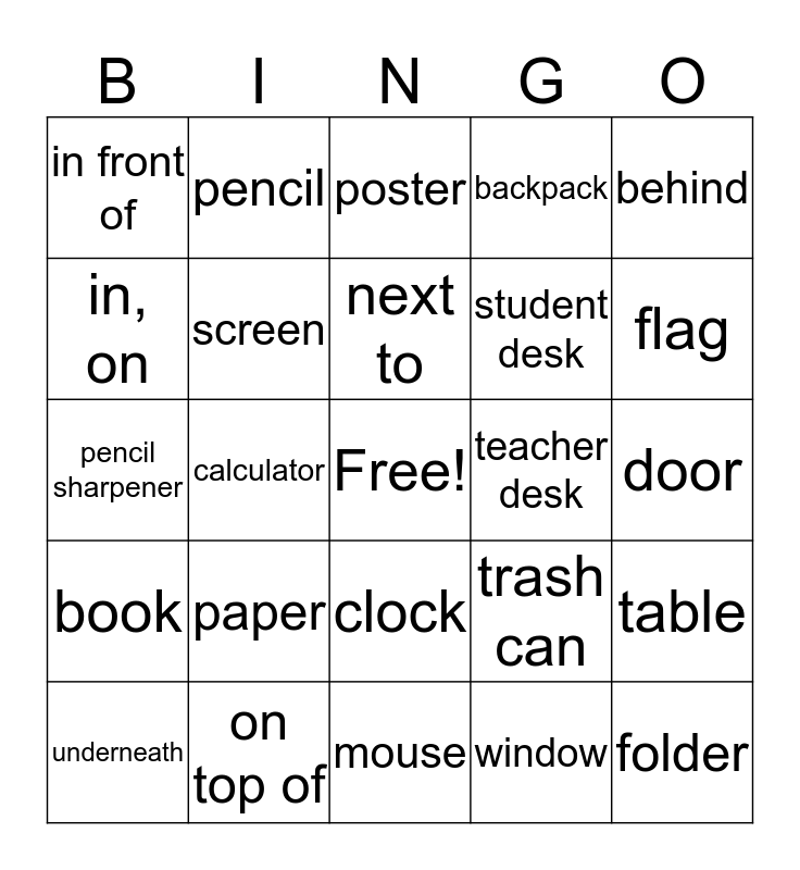 This bingo card has a free space and 24 words: paper, on top of, next to, underneath, behind, in front of, in, on, pencil, teacher desk, clock, student desk, pencil sharpener, trash can, table, screen, window, door, poster, flag, calculator, folder, book, backpack and mouse.