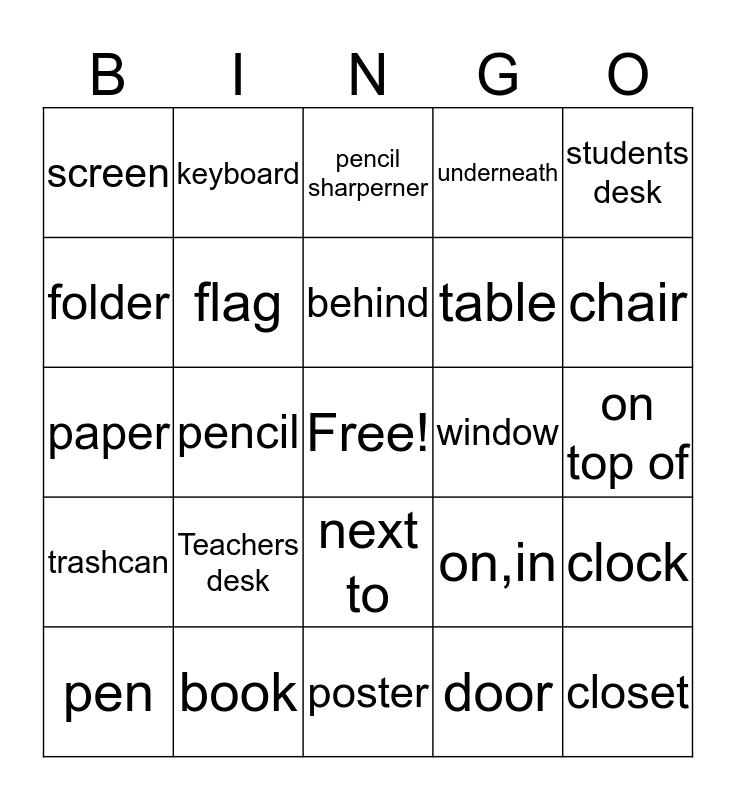 This bingo card has a free space and 24 words: Teachers desk, book, behind, pen, students desk, screen, folder, keyboard, window, next to, table, paper, on,in, clock, flag, door, on top of, pencil sharperner, chair, pencil, closet, trashcan, underneath and poster.